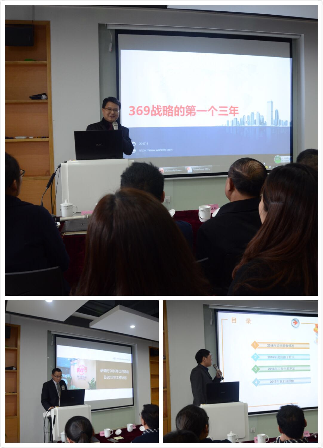 公司董事长何明龙最后以“收获、战略、实施”三个关键词对集团进行了工作亮点总结及未来发展战略展望,并对公司及各事业部、子公司分别提出了2017年度“十六字”方针。号召大家在2017年继续努力,强调了人才的重要性,呼吁各事业部及子公司在现有团队的基础上,招贤纳才,培养好现有的人员,积极引进先进人才;鼓舞各事业部和各子公司在2016年度工作情况的基础上,努力完成2017年度的小目标,继续实施完成 “369战略”;更强调了公司对冲击新三板创新层,努力转板创业板的决心。何总更对2017年的工作明确了方向:要想在激烈的经营与资本的市场环境中生存、发展、壮大,我们必须紧紧抓住主业,继续实施稳定的发展战略,咬定目标不放松。紧跟习主席,撸起袖子加油干!公司将坚守一贯以来稳健发展的方略,持续创新,使万人调查不断地健康良性发展,给所有的员工、合作伙伴、股东带来良好的回报!
